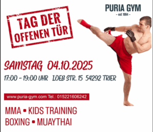 Tag der offenen Tür 2025 Juli 16, 2025 Tag der offenen Tür im Puria GYM – 04.10.2025 in Trier Am Samstag, den 04. Oktober 2025, öffnen wir von 17:00 – 19:00 Uhr unsere Weiterlesen »